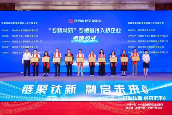 来自工业和信息化部中小企业局、省政协、省工业和信息化厅、省委金融办、陕西证监局、省财政厅、宝鸡市人民政府、陕西金融控股集团、招商银行西安分行、陕西股权交易中心10家单位的相关负责同志共同为陕西“专精特新”专板按下启动键。首批105家企业登陆专板,首批10家培育层入板企业代表上台接受授牌。陕西股权交易中心相关业务负责人作主题为《专精特新专板赋能企业高质量发展》的主题分享,介绍了陕西“专精特新”专板的服务体系与赋能路径。由集团公司等单位发起的陕西钛产业升级股权投资基金正式启动,银行、政府、高校、非银金融机构与钛产业企业签约。